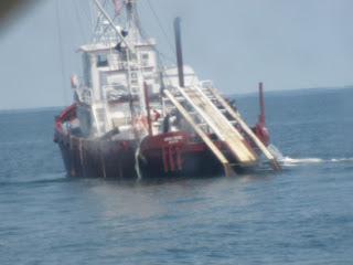 About 5 miles SW of the island, we went through a Menhaden fishing fleet. There were three "mother ships" anchored in our way and several small boats handling nets that they had cast for a fish called Menhaden. The small boats bring the nets full of fish up to the mother ships where they are stored. Pretty interesting. We saw several "pods" of these fishing boats all around the area.